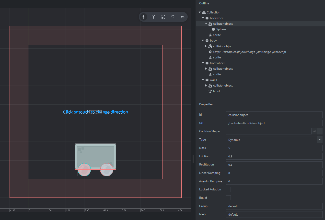 tags: physics title: Hinge joint physics brief: This example shows a simple setup with a dynamic body physics object and two dynamic wheel physics object joined together with a joint of type "hinge". The hinge joint can simulate an axle or a pin on which other object is rotating in respect to the base. The example shows how to create, destroy and change properties of the joints. author: Pawel Jarosz